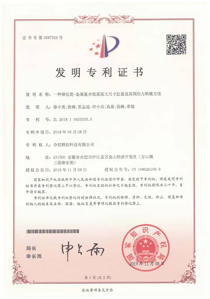 (2018發(fā)明專利)一種鋼化瓷-金屬復合泥漿泵大尺寸缸套及其預應力熱裝方法
